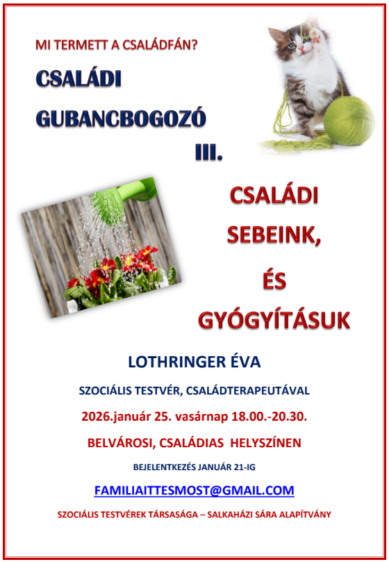 A CSALÁDI GUBANCBOGOZÓ III. alkalmával 2026. január 25-én, vasárnap este 6-tól beszélgessünk most a kapott-adott családi sérülésekről, hatásukról, a megértési, enyhítési, esetleg valóban gyógyítási lehetőségeinkről.